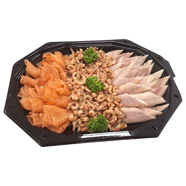 Een heerlijke schotel, rijkelijk gevuld met Hollandse garnalen, gerookte zalm en gerookte palingfilet.