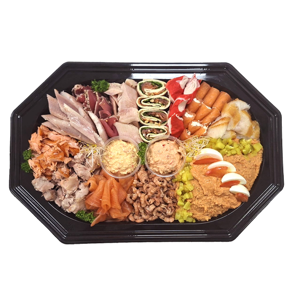 Met zalmsalade, heilbot, zalmbonbons, crabchunks, wraps, gerookte forel, tonijntataki, zalmsnippers, gerookte palingfilet, warm gerookte zalm, makreelfilet en 2 soorten salades.